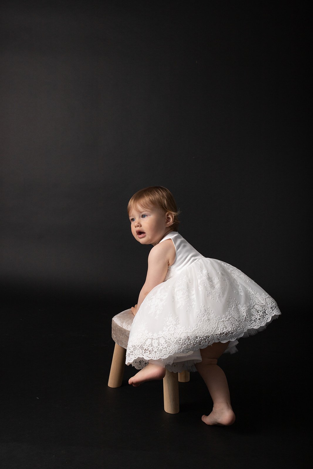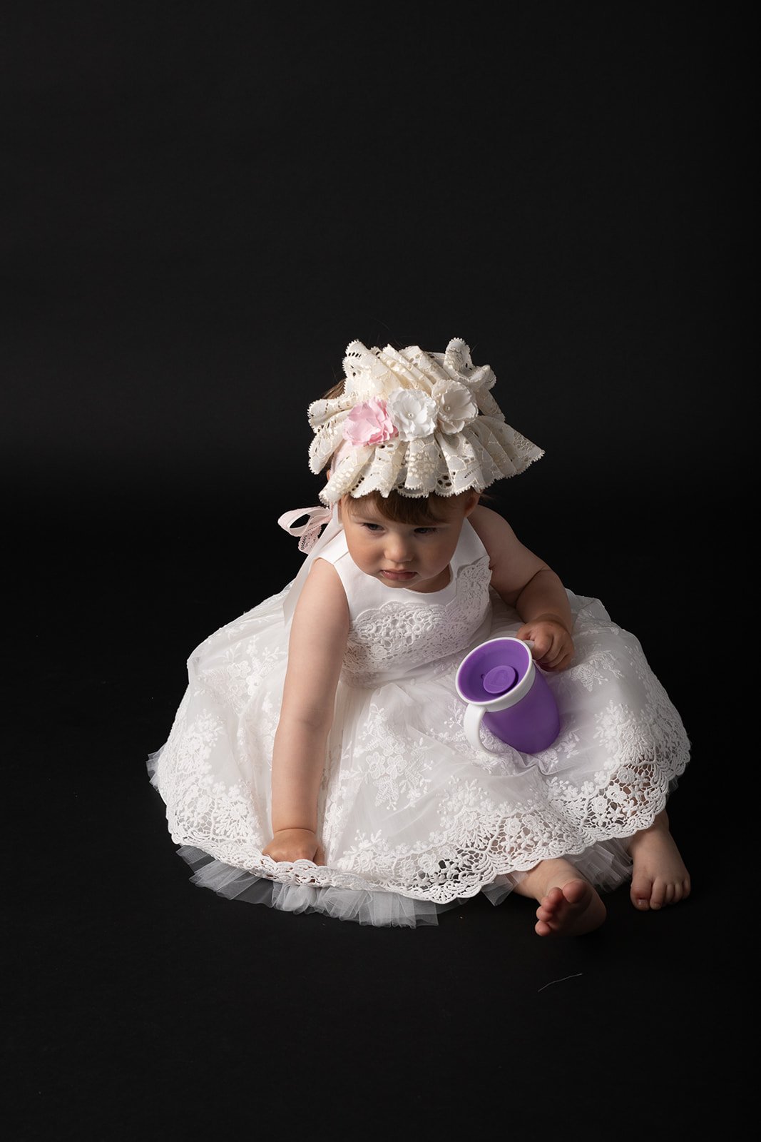 A pristine white Christening dress made with tulle and satin that features beautiful embroidery, floral motifs, and feathery shoulders. It has a pleated, flowy skirt and see-through long sleeves.  Your little princess will be the centre of attention at her christening.