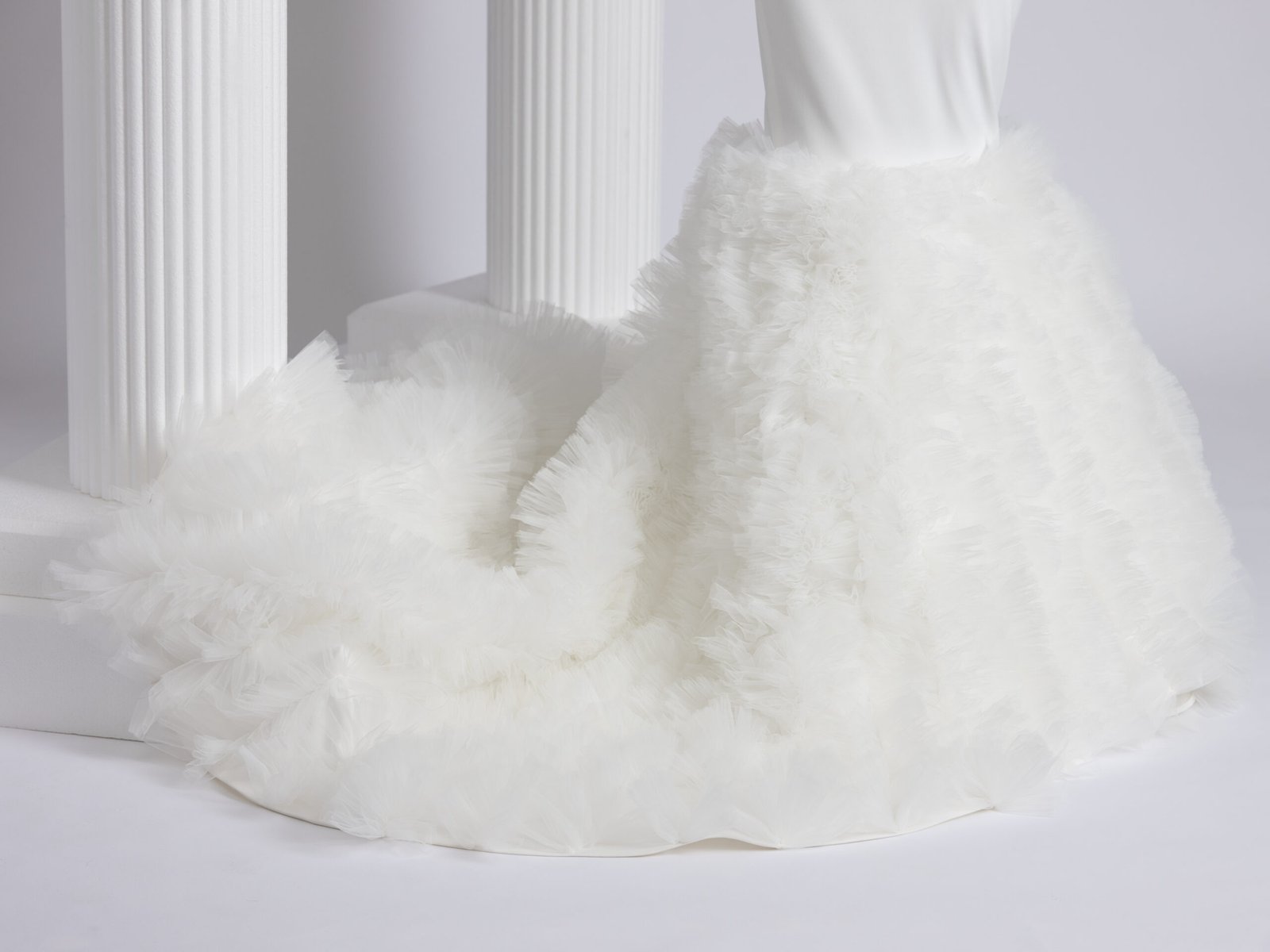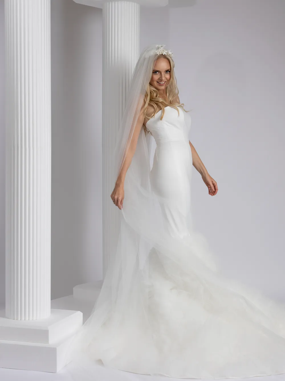 The mermaid silhouette of this wedding dress, crafted from exceptionally soft crepe and tulle, is a masterpiece of bridal fashion. This ensemble accentuates the bride’s figure with grace and embodies a perfect blend of elegance and whimsy, making it a captivating choice for a memorable celebration.